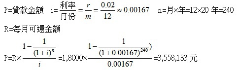 上次跟朋友聊到成家立業的事,結婚後可能就要考慮到買房子的事了,記得有專家聊到房貸最好不要超過家庭收入的1/3,否則繳太多的房貸會影響到生活品質。但以現在的房市,除非你和配偶的月收入不錯,要不然就只能買低總價的房子了。假設男生一個月領3萬元,女生一個月領2.4萬,家庭月收入總共5.4萬,1/3就是1.8萬。如果假設每個月可以還1.8萬的貸款,那我們回推看看,如果以房貸利率2%來算,可以向銀行貸得多少錢?Rick Chen 發表在 痞客邦 留言(1) 人氣(2,915)