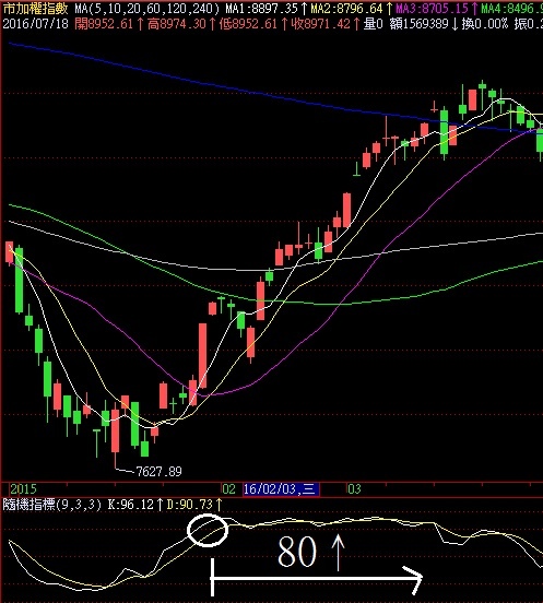 有鑑於此,有人利用「大盤」的 KD指標,來賭加權指數的多空,利用加權指數的漲跌來波段操作「0050」(看大盤的KD買0050,而非看0050的KD買0050,利用它們兩者間的連動關係來操作買賣,大盤走空,0050上漲的機會低,大盤走強,0050走弱機會低),加權指數KD指標低於20時買進0050,高於80時賣出。
